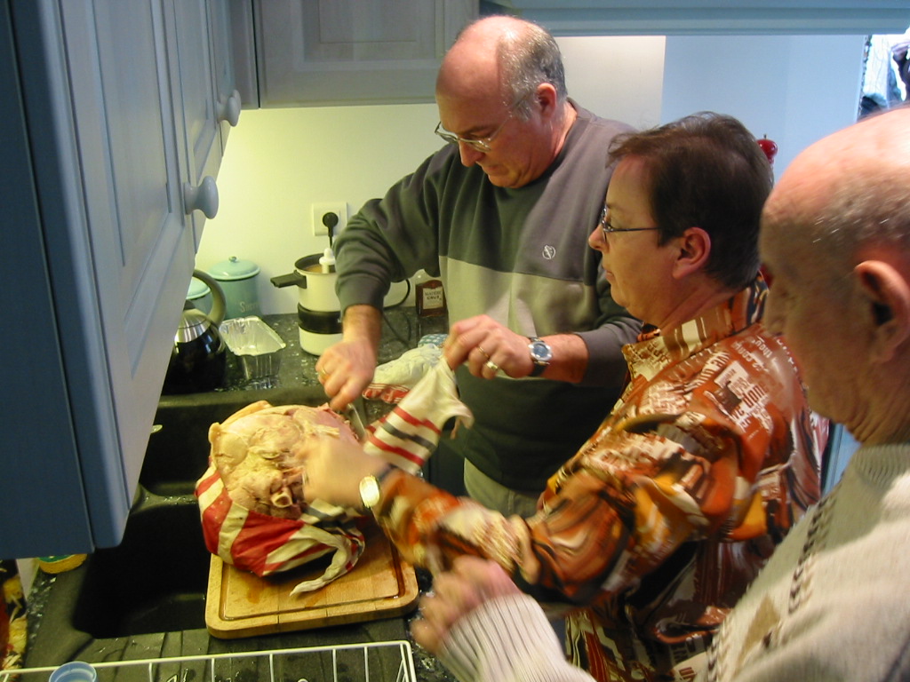 Sylvain spent the afternoon working on stuff and I spent it in the kitchen baking goodies with my mom: gingerbread cookies, peanut butter blossoms and even a pear tart. The gingerbread cookies came out wonderfully (I didn’t realize how involved making gingerbread cookies would be). The peanut butter blossoms came out…okay. They taste fine, they just don’t look like they’re supposed to. (Next year, forego the reduced fat peanut butter and buy the real stuff.) My mom had received a box of pears from Harry and David at work and wanted to incorporate them into a tart of sorts. The pears were unbelievably sweet and juicy – like we had just opened a can of pears. We tweaked the recipe a bit and the tart came out pretty good, a bit juicy, but good.