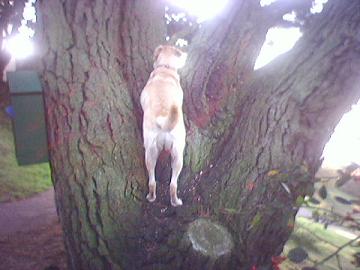 This morning at the p-a-r-k with Sylvain, Lucie decided to brush up on her hunting (and climbing) skills and chase after and look for squirrels. Sylvain tells me that she would have kept climbing if he didn’t call her down. Heh.