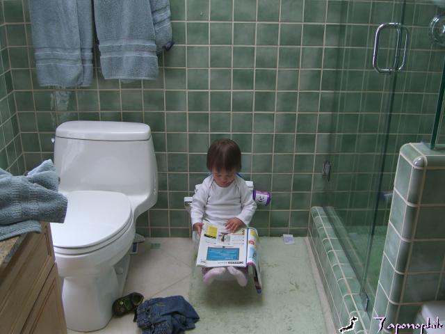 Though we’re in no rush, we decided to buy a training potty for Mads, just to get her used to the idea. Natch, we bought the one with all the bells & whistles – it sings, makes fun sounds, does everything short of dancing. She seemed to take to it, she’d sit on it, with or without a magazine and pretend flush when she was finished.