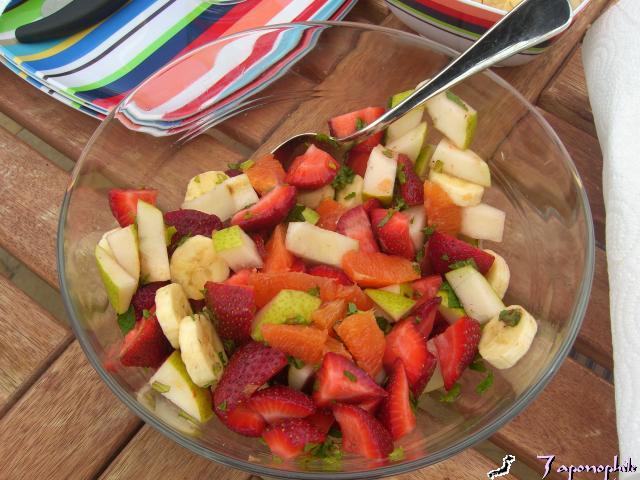 and a fruit salad: strawberries, pears, cara cara oranges, bananas, chopped mint. Both were delicious and refreshing on that sweltering day.