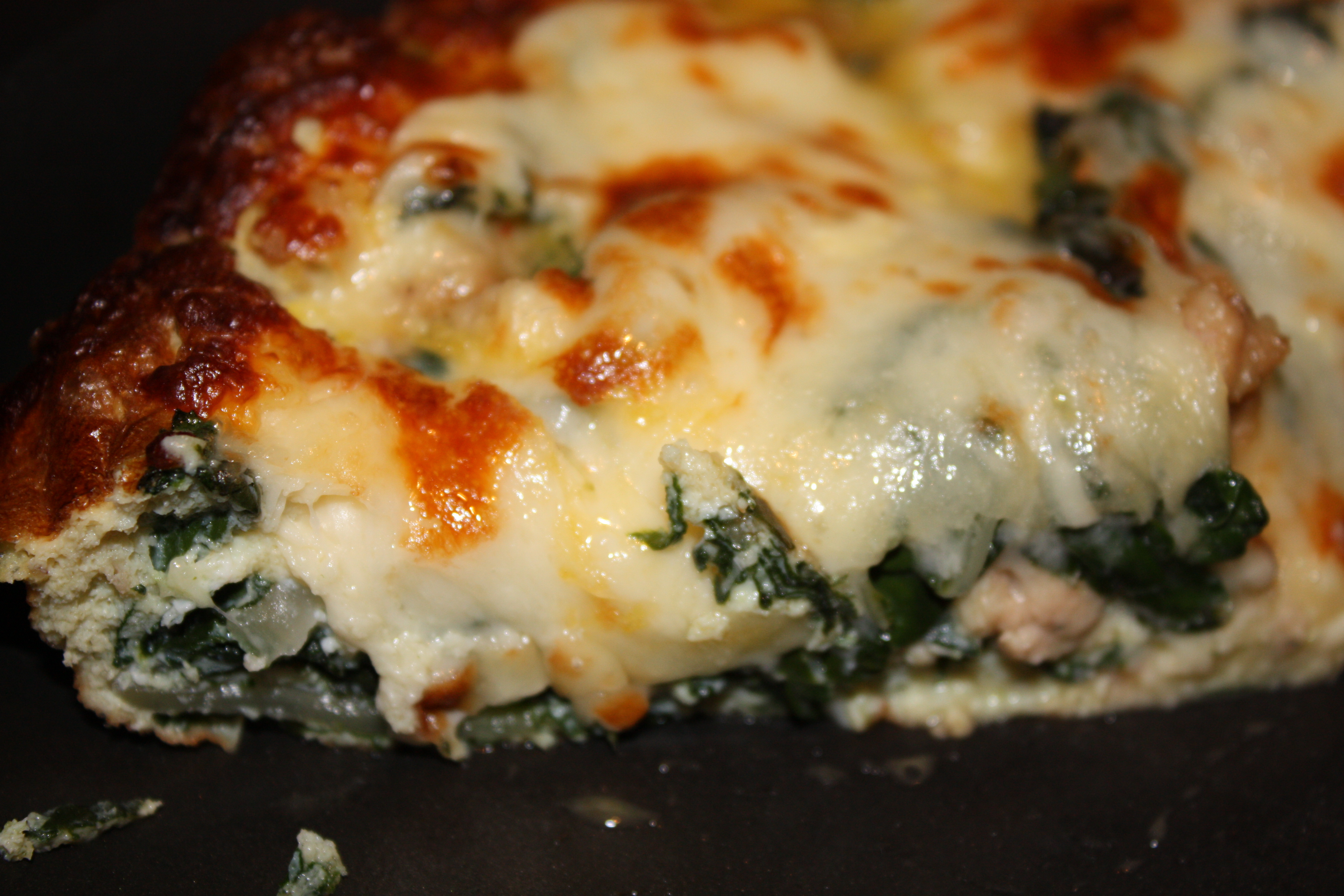 Preheat the broiler. Saute the onions in half the olive oil until cooked, crumble the sausage into the pan and saute until cooked. Add the chopped greens and saute until the greens are cooked. (The chard will turn dark green.)