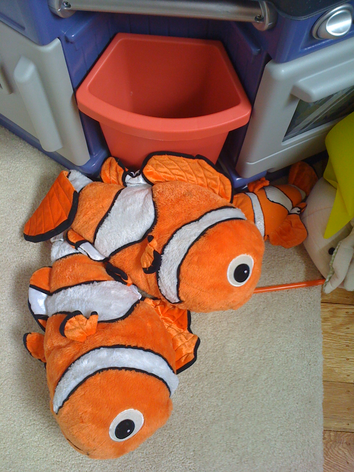 For those of you who know Peanut well, Nemo was the end all, be all for a long, looooong time. Nemo treats, Nemo movie, Nemo books, Nemo hats, Nemo swim diapers, Nemo beach towel, Nemo jibbitz.For a time, I got real good at drawing clown fish. Peanut has 3 Nemo plush dolls – 2 “regular” size and 1 mini size. They’ve traveled the world with her: Minneapolis, Chicago, Maui and France – and they typically sleep on Peanut’s bed. One recent afternoon, I walked into Peanut’s room to put something away, and discovered Daddy, Mommy and Baby Nemo on the floor. I asked Peanut what they were doing there and she told me that Nemo is for babies. I have yet to put the Nemo family away and maybe I am quick to say it’s the demise of Nemo – Peanut still asks for Nemo beach towel for “picnics”.