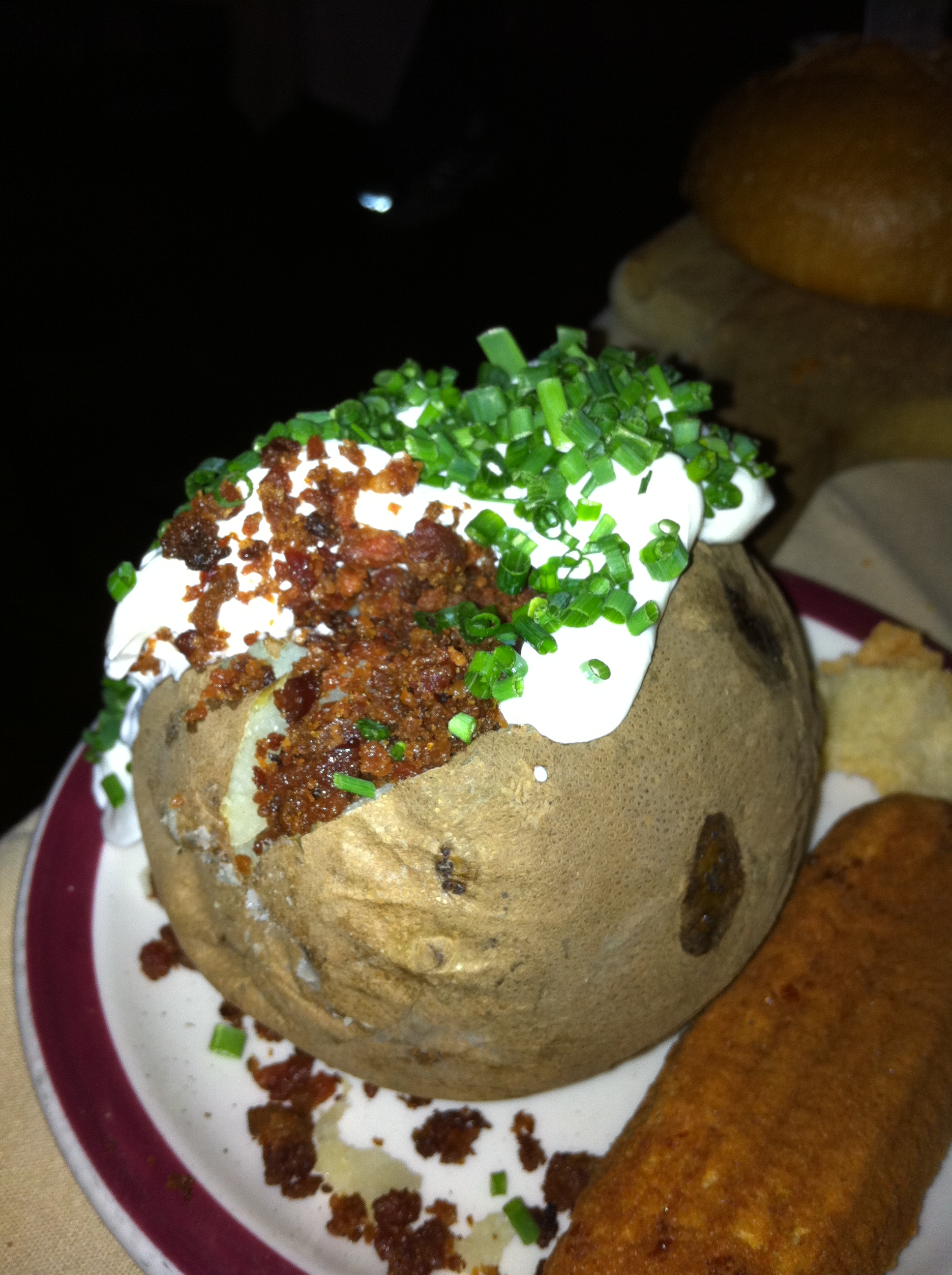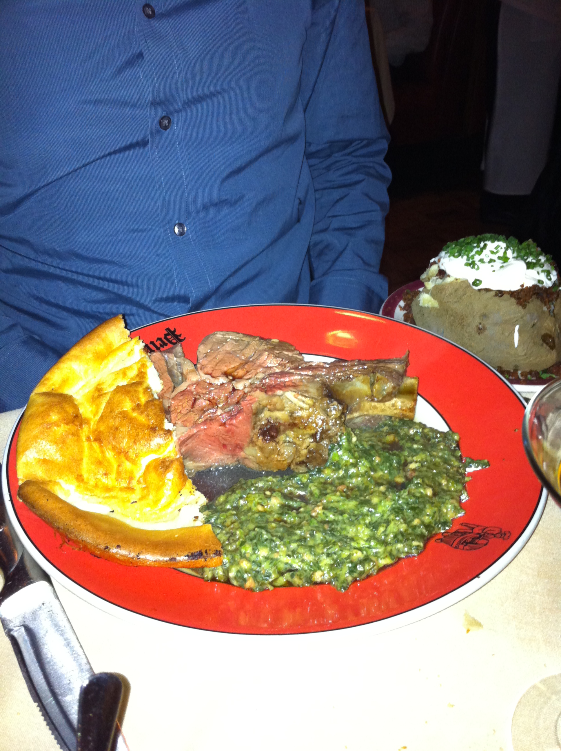 The goodness that was the HOPR salad, the baked potato overloaded with fixin’s, the creamed spinach, Yorkshire pudding, and of course the beef from the zeppelin of meat itself was worth the wait. Unfortunately, portion control did not cross my mind as I ate dinner. I’d like to say that I need the calories, but I pretty much ate everything. I passed on dessert, if that counts for anything.