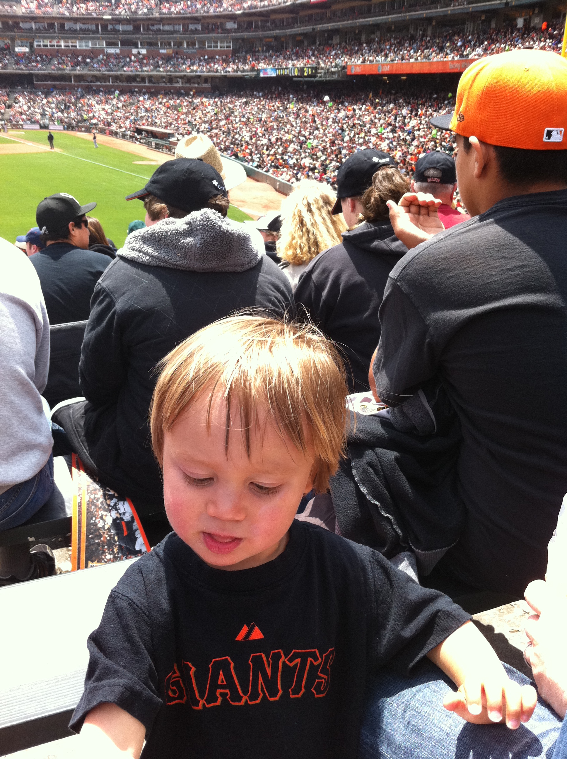 Finally, it’s Sunday and we are taking the kidlets to their first ever SF Giants game! Ringo is wearing his Lincecum tee shirt and Peanut, well, Peanut is dressed in pink and we’re all excited!